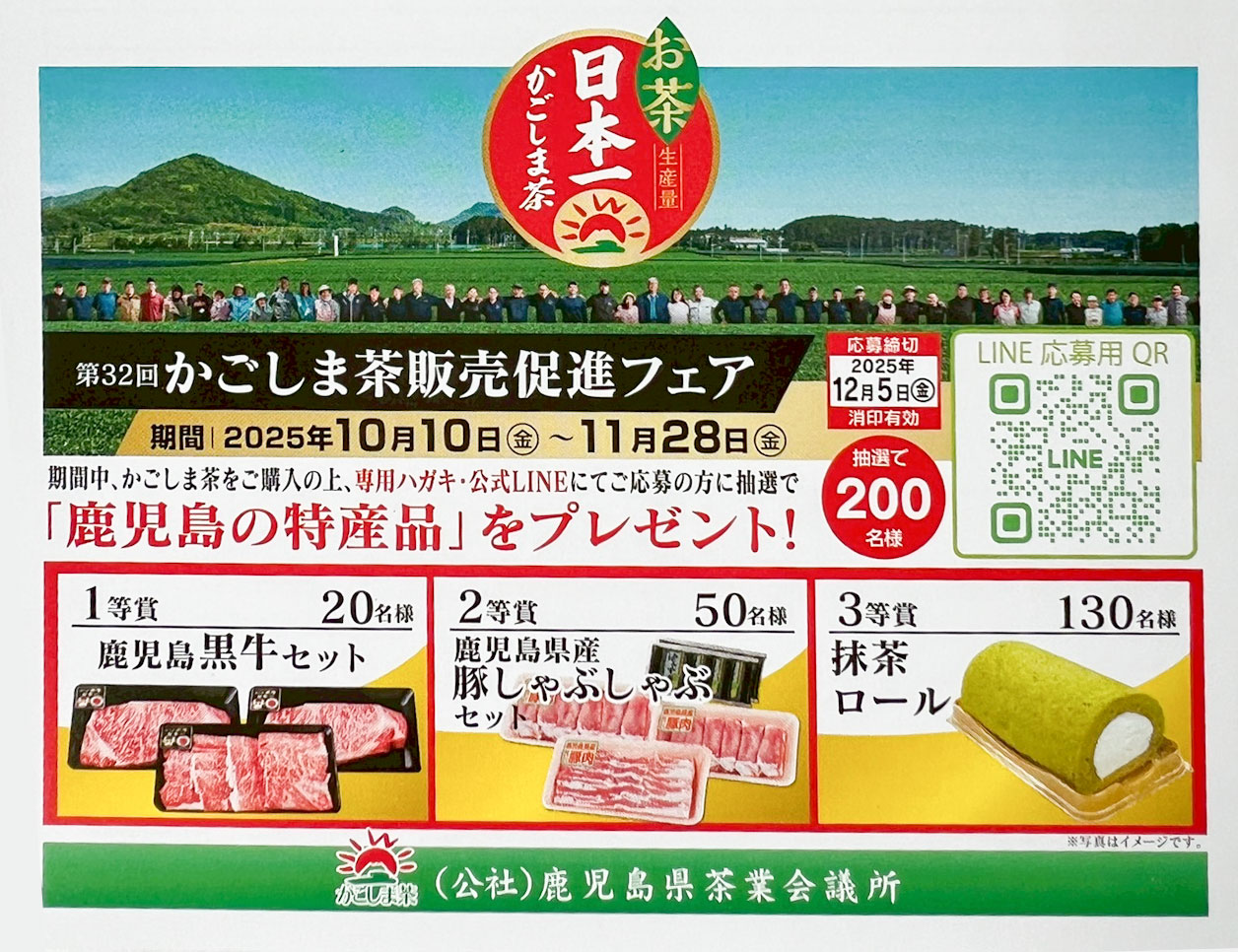 期間中、かごしま茶をご購入いただいた方で、または専用ハガキや公式LINEからご応募いただいた方の中から、抽選で総勢200名様に鹿児島の特産品をプレゼント。
